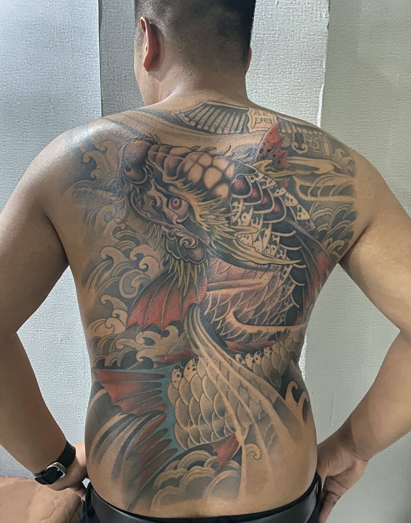鱼跃龙门纹身图片_背部新传统纹身图案