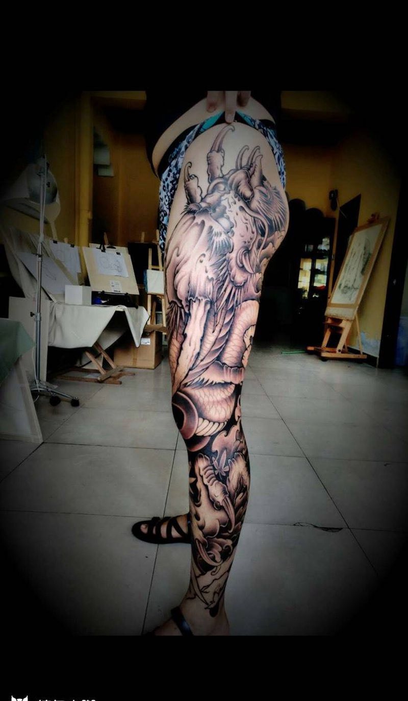 • T网红王老大花腿龙纹身图片_腿部新传统纹身图案
