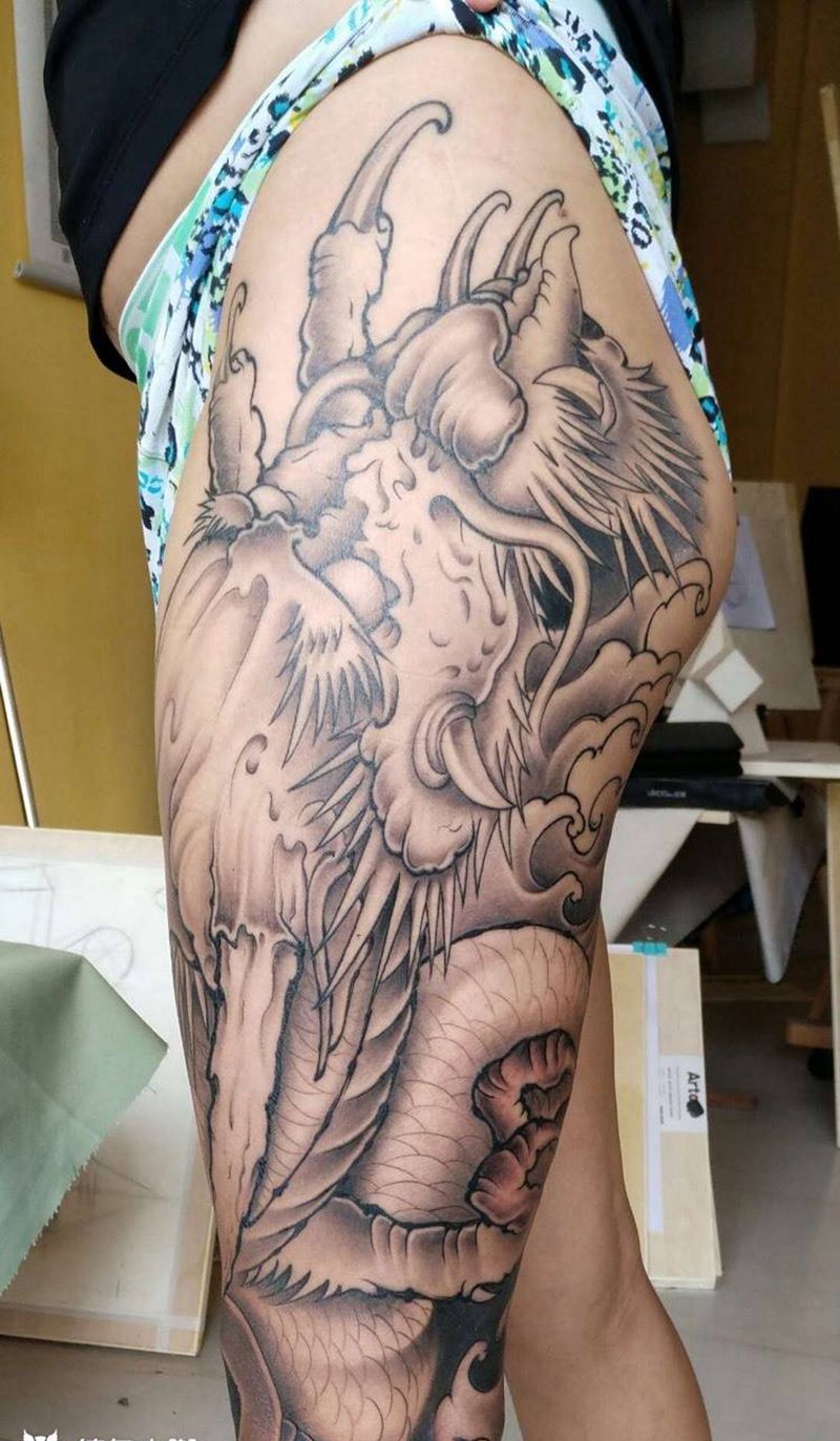 • T网红王老大花腿龙纹身图片_腿部新传统纹身图案