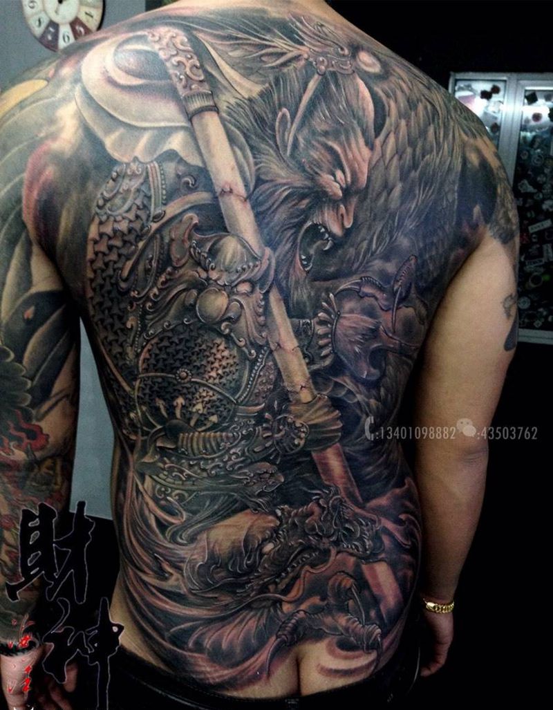 当前位置: 首页 >北京市纹身店-北京财神纹身工作室纹身图案>斗战圣佛纹身图片_成品肩部背部传统欧美人物鬼神宗教纹身图案