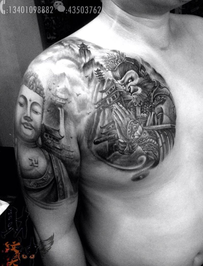 拜佛半甲纹身图片_传统欧美人物鬼神宗教胸部手臂纹身图案