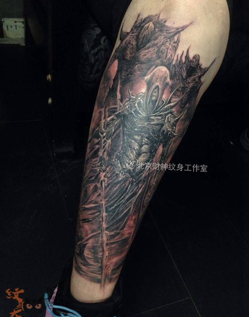 当前位置: 首页 >北京市纹身店-北京财神纹身工作室纹身图案>未完成纹身图片_插画原创人物鬼神写实欧美腿部纹身图案
