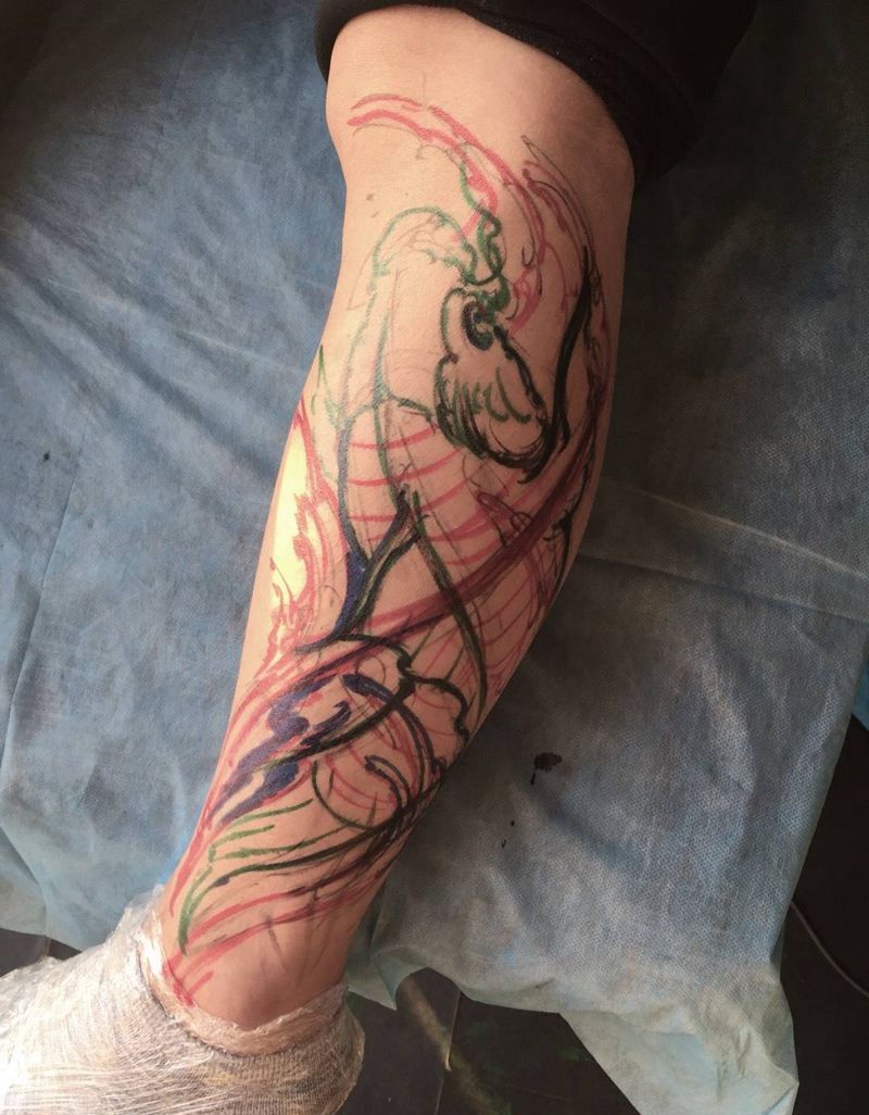 • T网红王老大花腿龙纹身图片_腿部新传统纹身图案