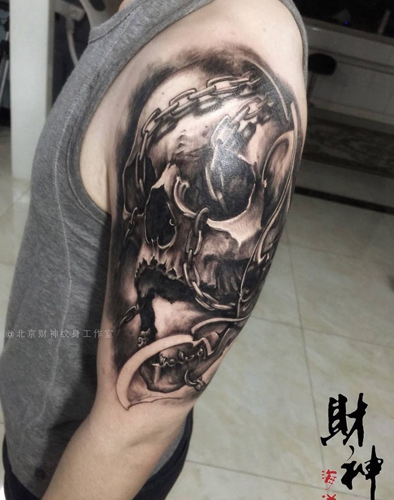 当前位置: 首页 >北京市纹身店-北京财神纹身工作室纹身图案>欧美骷髅纹身图片_成品肩部手臂欧美写实鬼神纹身图案