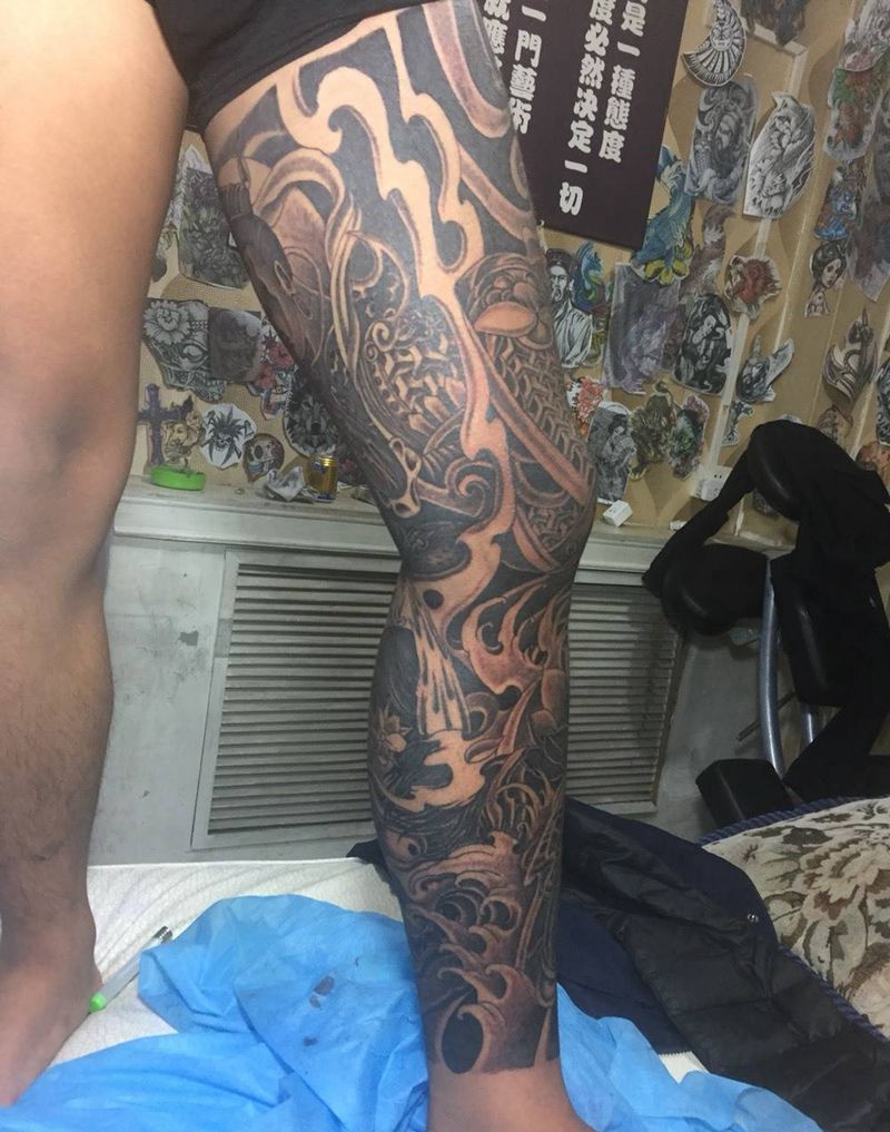 • T网红王老大花腿龙纹身图片_腿部新传统纹身图案