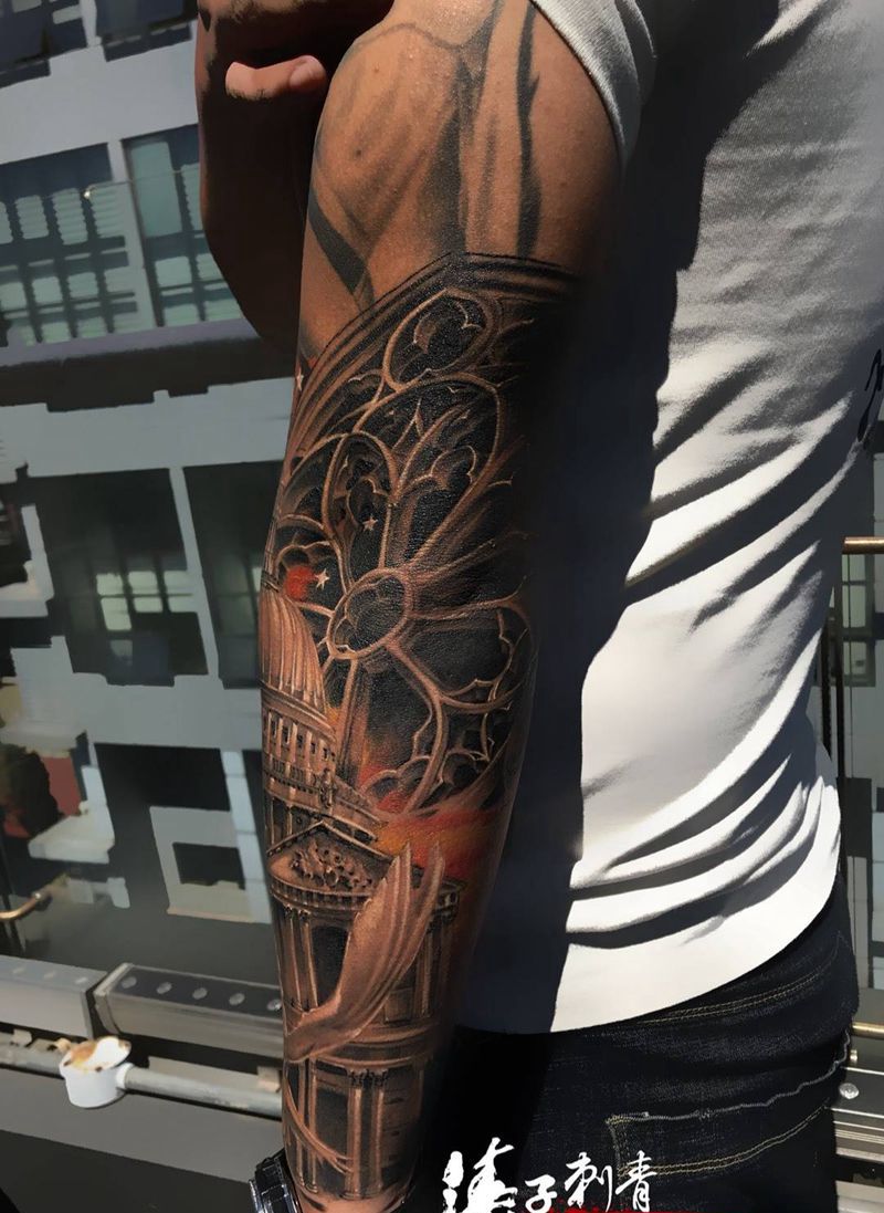 当前位置: 首页 >北京市纹身店-北京涛子刺青社纹身图案>教堂纹身图片_手臂欧美写实水彩纹身图案