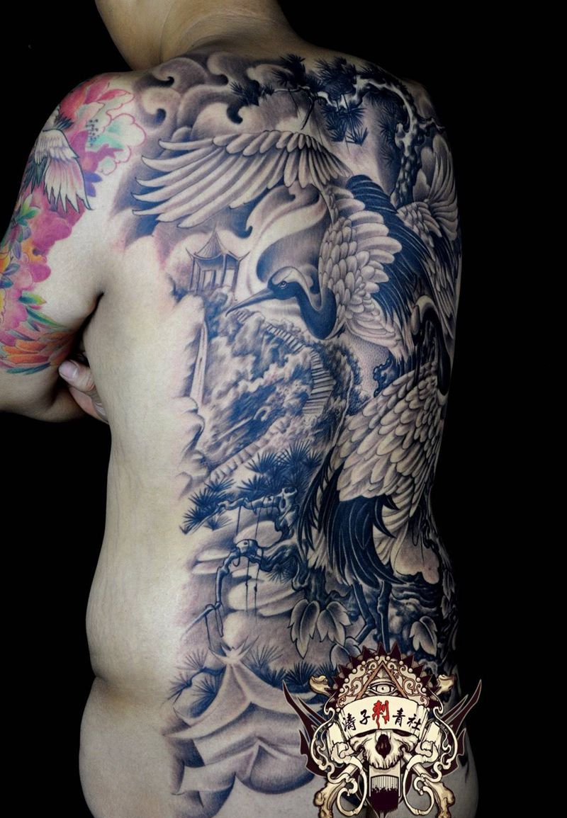 松鶴延年纹身图片_成品背部传统动物纹身图案