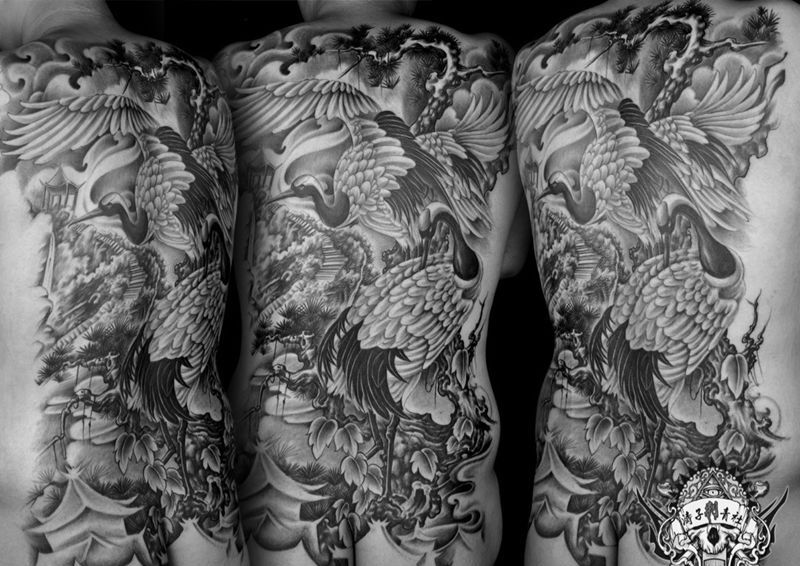松鶴延年纹身图片_成品背部传统动物纹身图案