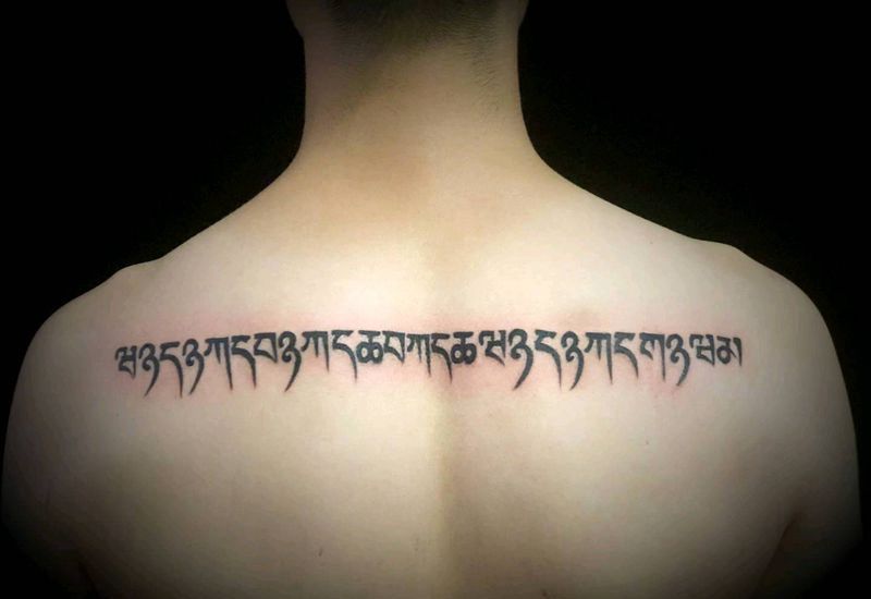 一念天堂 一念地狱纹身图片_背部图腾水墨藏文 梵文纹身图案