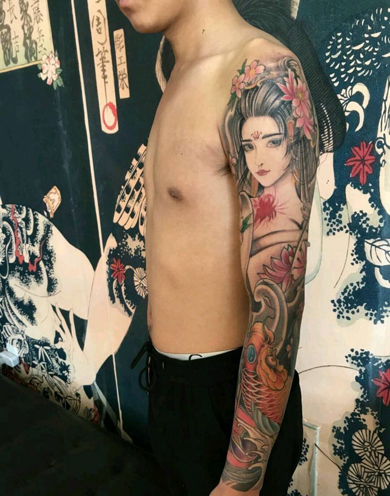 当前位置: 首页 >北京市纹身店-皓刺青纹身图案>彩色花臂纹身图片_手臂新传统鱼 艺姬纹身图案