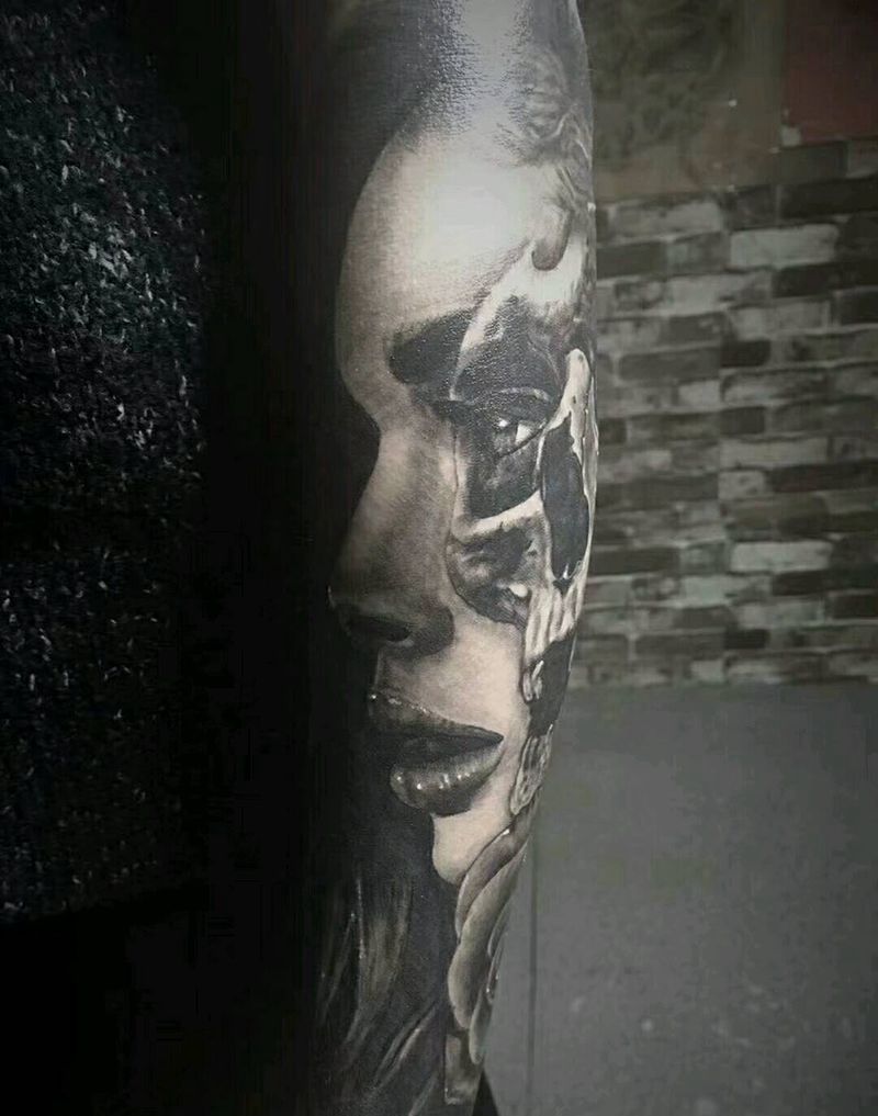 当前位置: 首页 >北京市纹身店-皓刺青纹身图案>女人与骷髅纹身图片_手臂欧美写实人物鬼神成品纹身图案