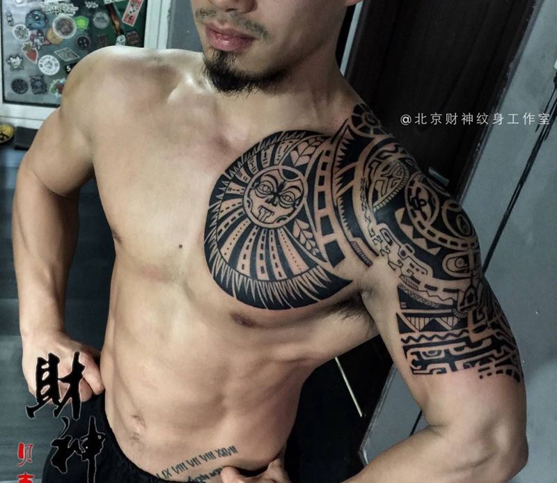 当前位置: 首页 >北京市纹身店-财神纹身工作室纹身图案>强森纹身图片_成品肩部胸部传统字符图腾纹身图案