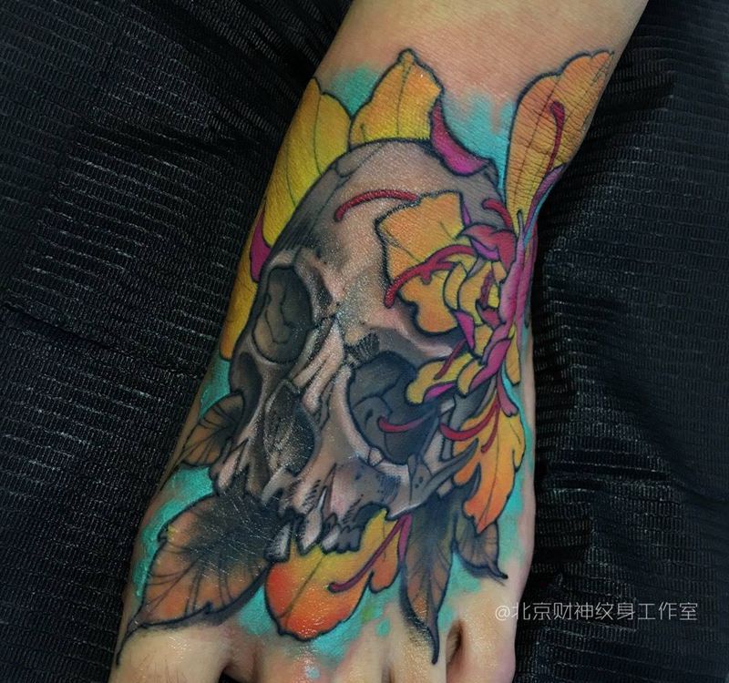 当前位置: 首页 >北京市纹身店-财神纹身工作室纹身图案>骷髅纹身图片_成品脚部欧美植物人物纹身图案