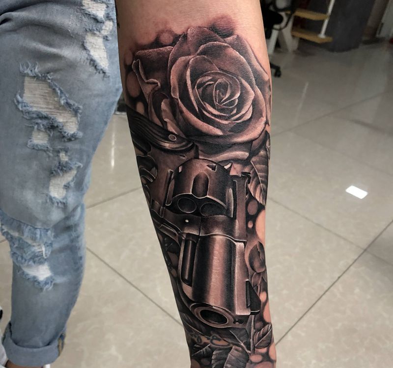当前位置: 首页 >北京市纹身店-财神纹身工作室纹身图案>枪花纹身图片_手臂欧美写实纹身图案