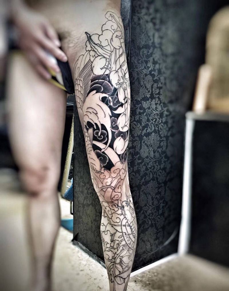 • T网红王老大花腿龙纹身图片_腿部新传统纹身图案
