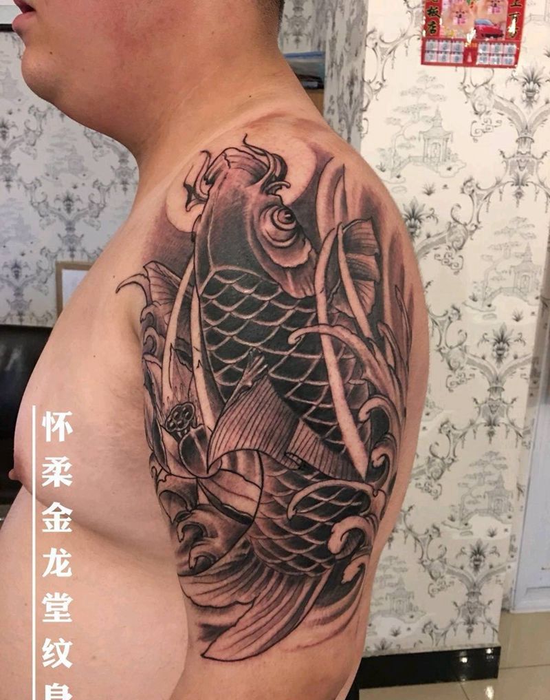 大臂锦鲤纹身图片_肩部手臂新传统纹身图案