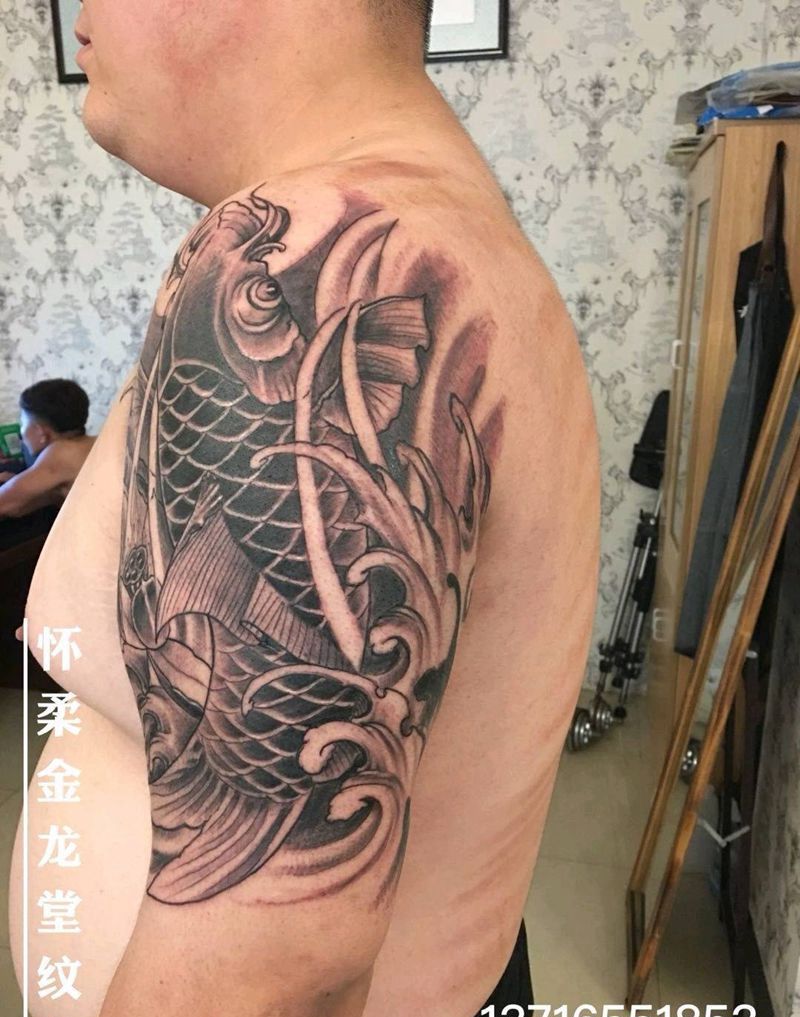 大臂锦鲤纹身图片_肩部手臂新传统纹身图案