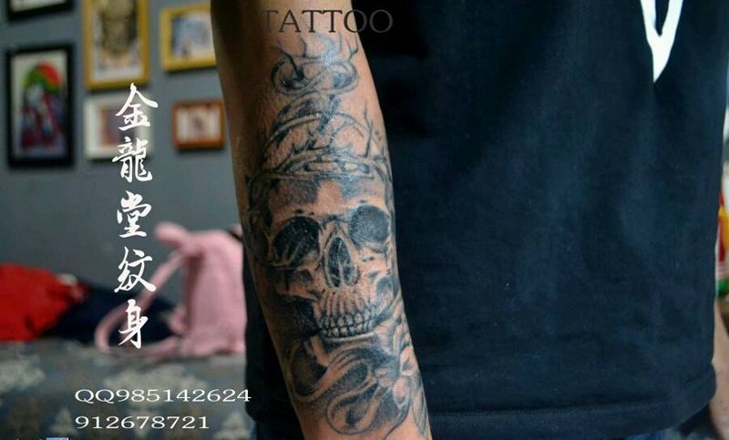 当前位置: 首页 >北京市纹身店-金龙堂纹身纹身图案>小臂骷髅纹身纹身图片_手臂传统写实静物成品纹身图案