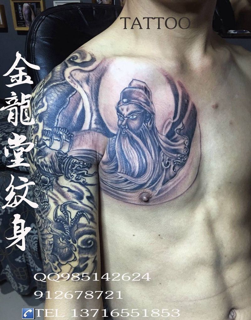 半甲关公龙纹身纹身图片_成品手稿胸部肩部传统人物动物纹身图案
