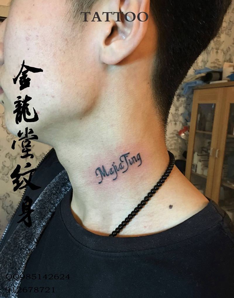 当前位置: 首页 >北京市纹身店-金龙堂纹身纹身图案>脖子文字纹身图片_成品颈部清新字符纹身图案