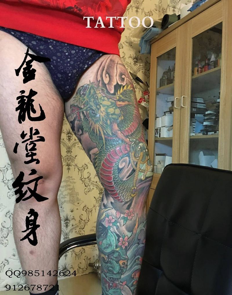 • T网红王老大花腿龙纹身图片_腿部新传统纹身图案