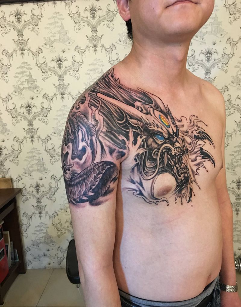 过肩龙纹身图片_胸部肩部新传统纹身图案