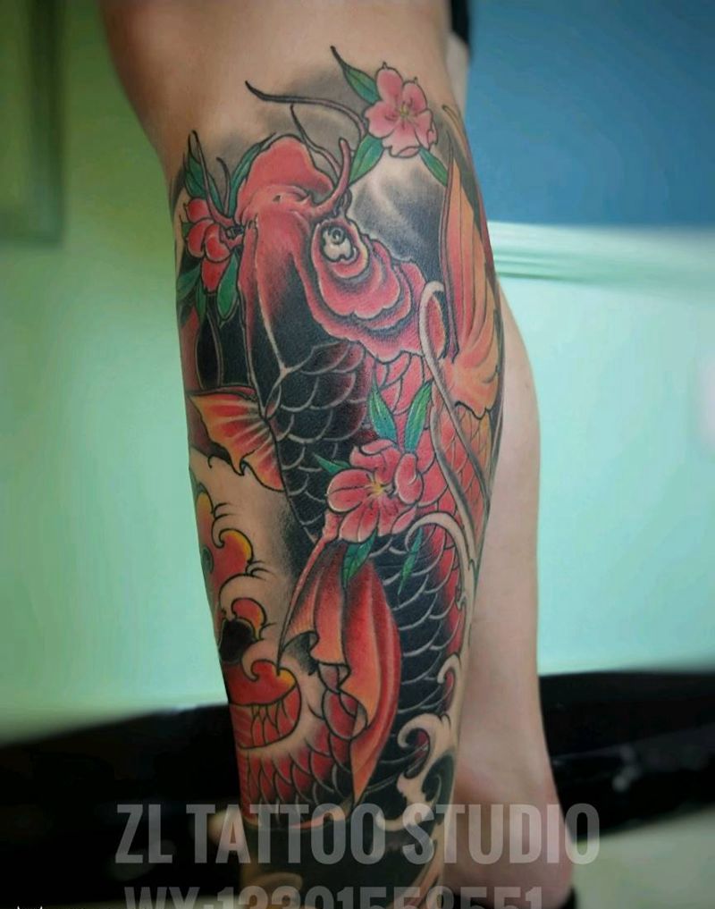鲤鱼牡丹纹身图片_腿部新传统纹身图案