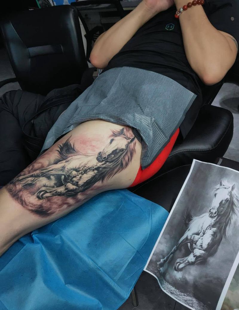 写实骏马完成!部分恢复后效果!纹身图片_腿部欧美写实纹身图案
