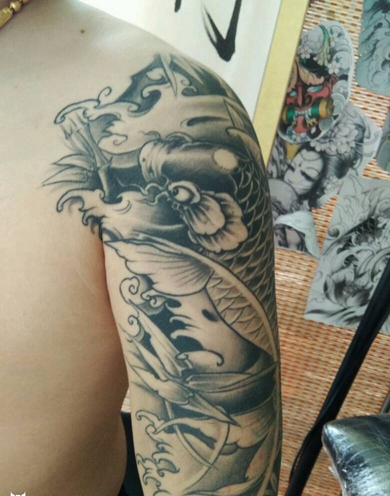小松刺青 大臂锦鲤恢复2年后纹身图片_手臂传统动物纹身图案