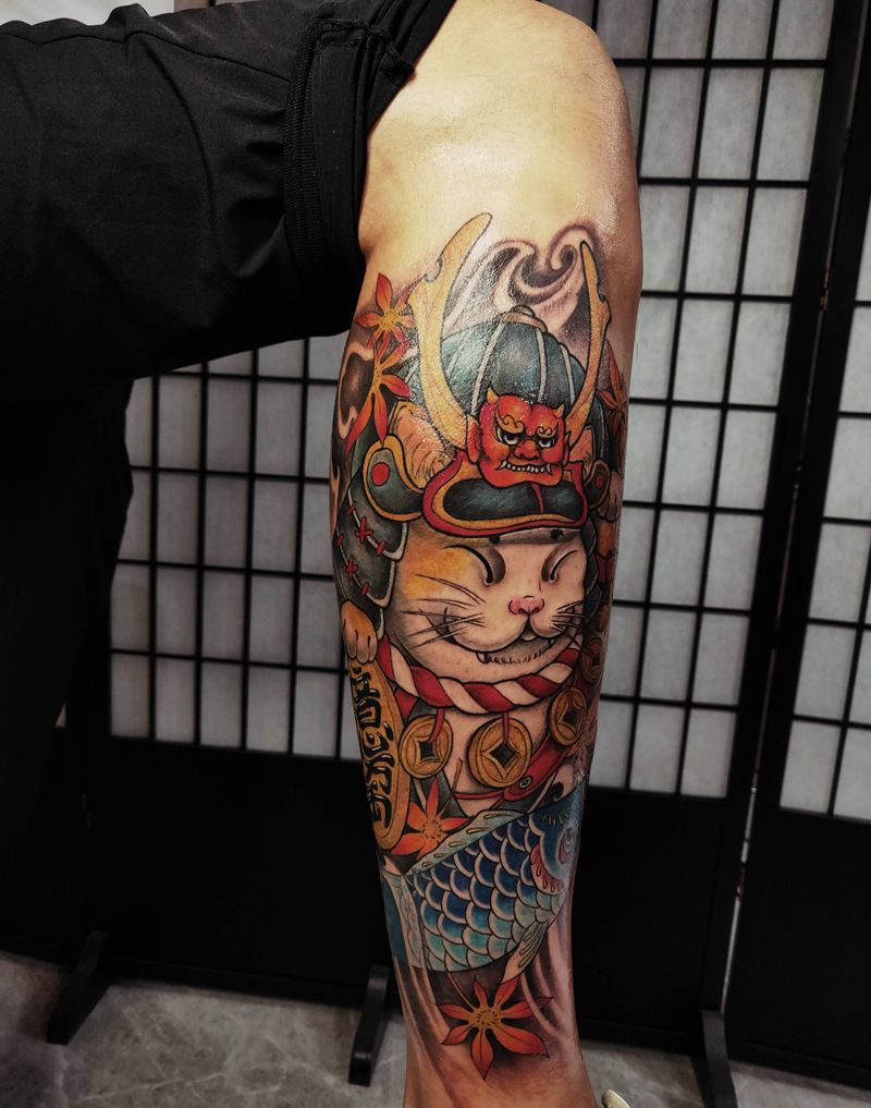 当前位置: 首页 >北京市纹身店-小松刺青工作室纹身图案>重彩招财猫完成!纹身图片_腿部新传统招财猫纹身图案