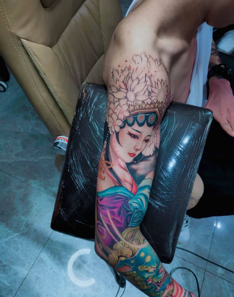 当前位置: 首页 >北京市纹身店-小松刺青工作室纹身图案>花旦搭配唐狮,花臂!纹身图片_手臂新传统纹身图案