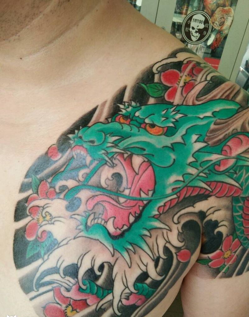 小松刺青 传统融合重彩龙纹身图片_肩部传统动物成品纹身图案