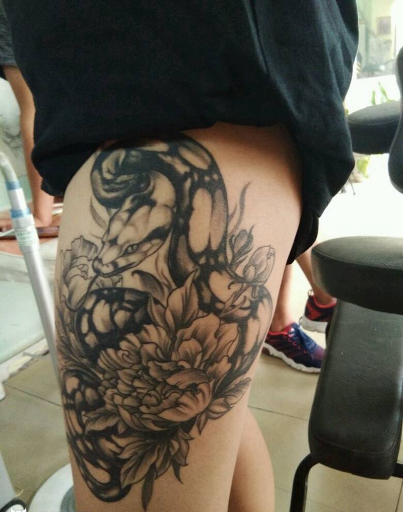 小松刺青 美女大腿蛇与牡丹纹身图片_