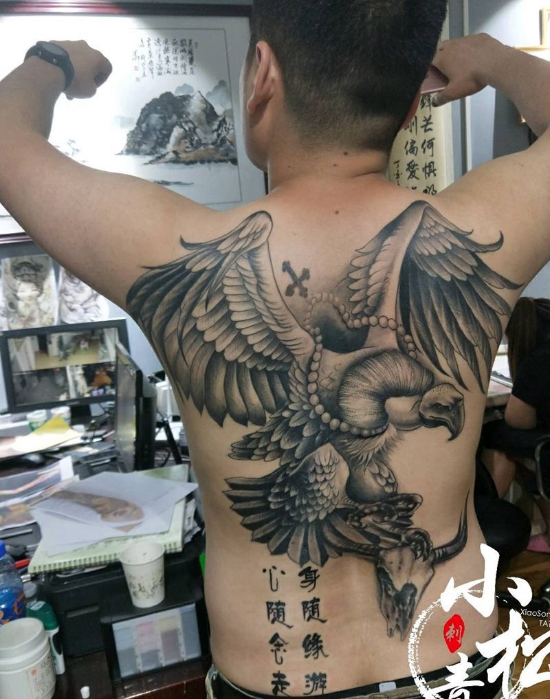 秃鹫纹身图片_背部成品纹身图案