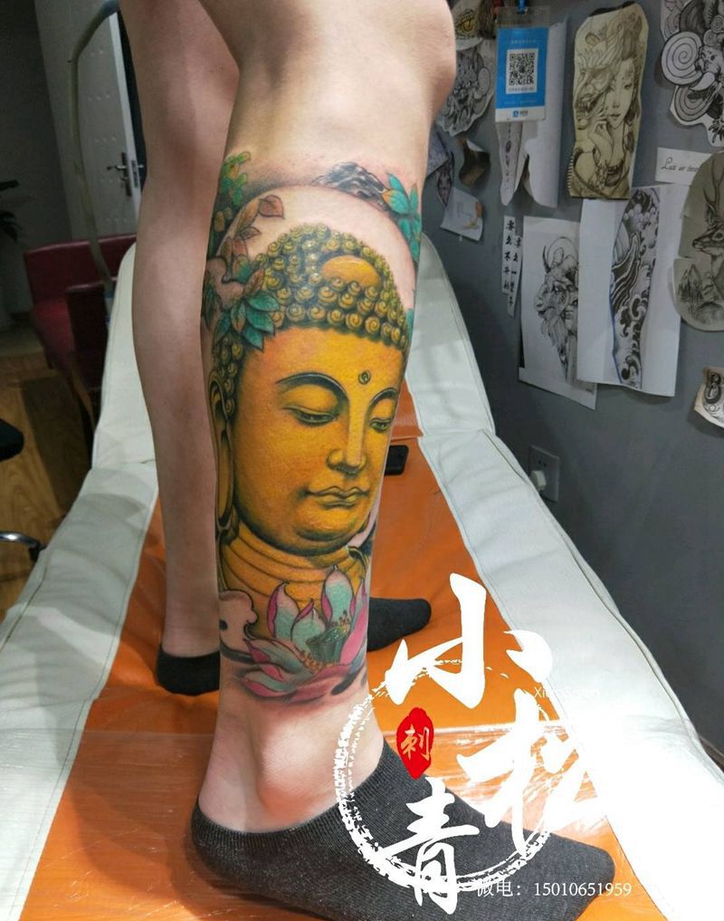 当前位置: 首页 >北京市纹身店-小松刺青工作室纹身图案>彩色佛包小腿纹身图片_