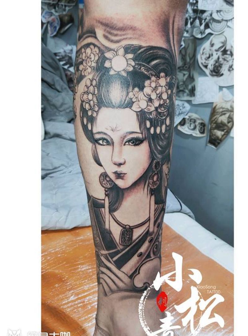 传统艺妓黑白风格纹身图片_腿部新传统纹身图案