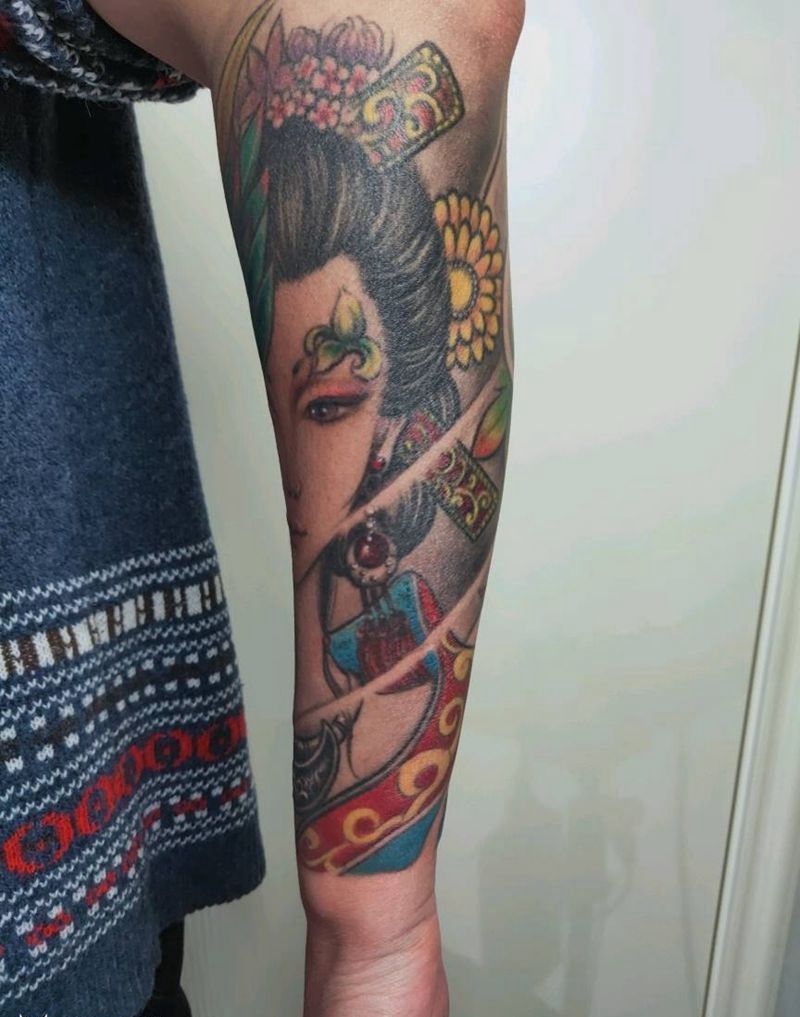 彩色艺伎包小臂纹身图片_手臂新传统纹身图案