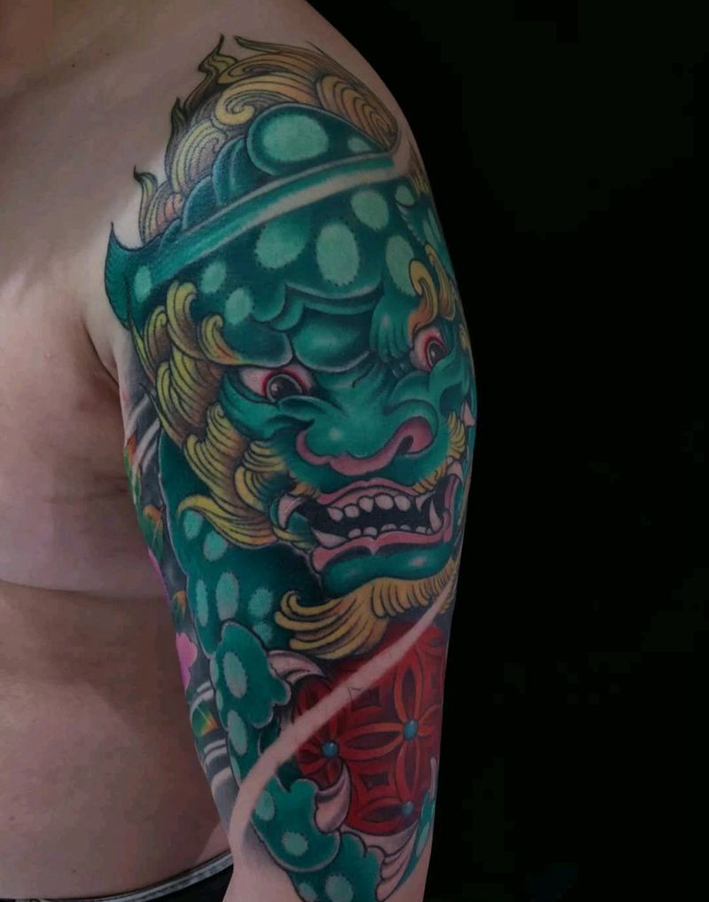 当前位置: 首页 >北京市纹身店-小松刺青工作室纹身图案>唐狮包大臂纹身图片_手臂新传统纹身图案