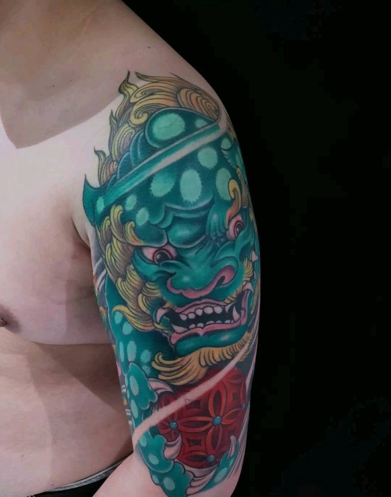 当前位置: 首页 >北京市纹身店-小松刺青工作室纹身图案>唐狮包大臂纹身图片_手臂新传统纹身图案