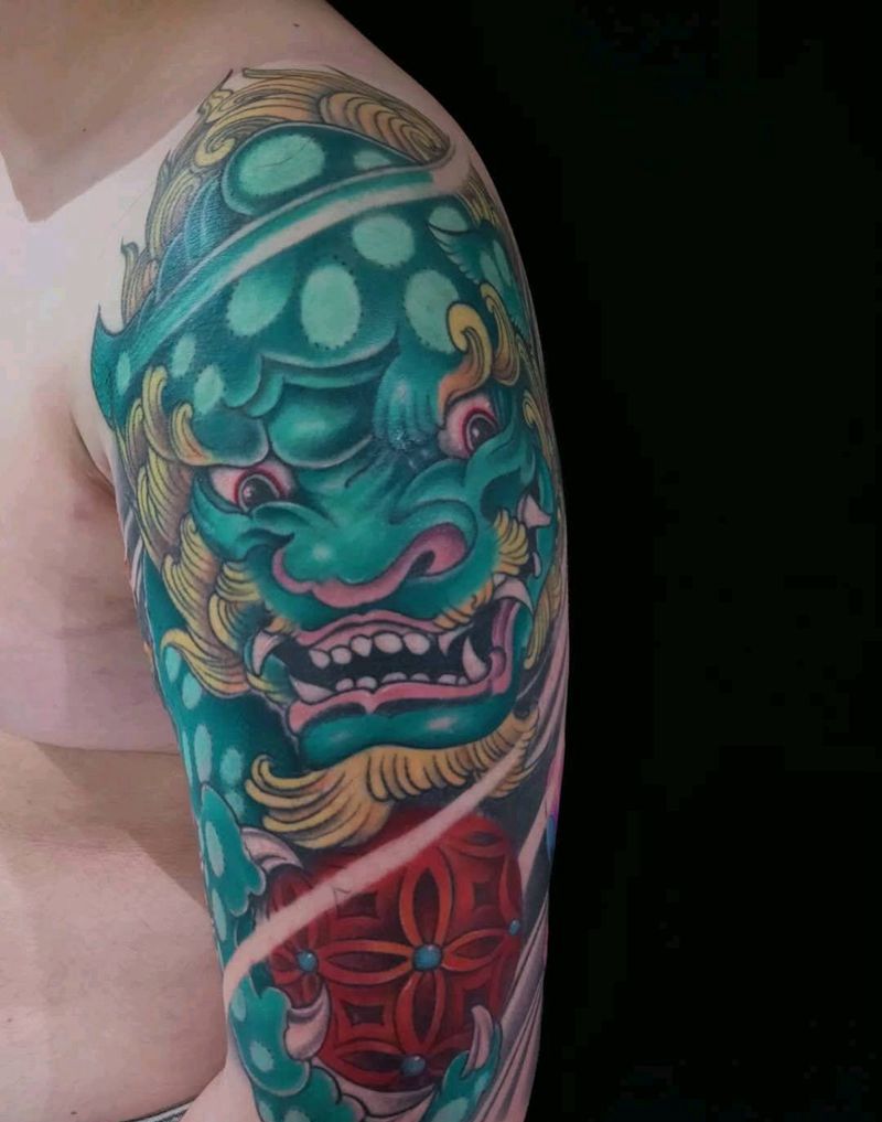 当前位置: 首页 >北京市纹身店-小松刺青工作室纹身图案>唐狮包大臂纹身图片_手臂新传统纹身图案