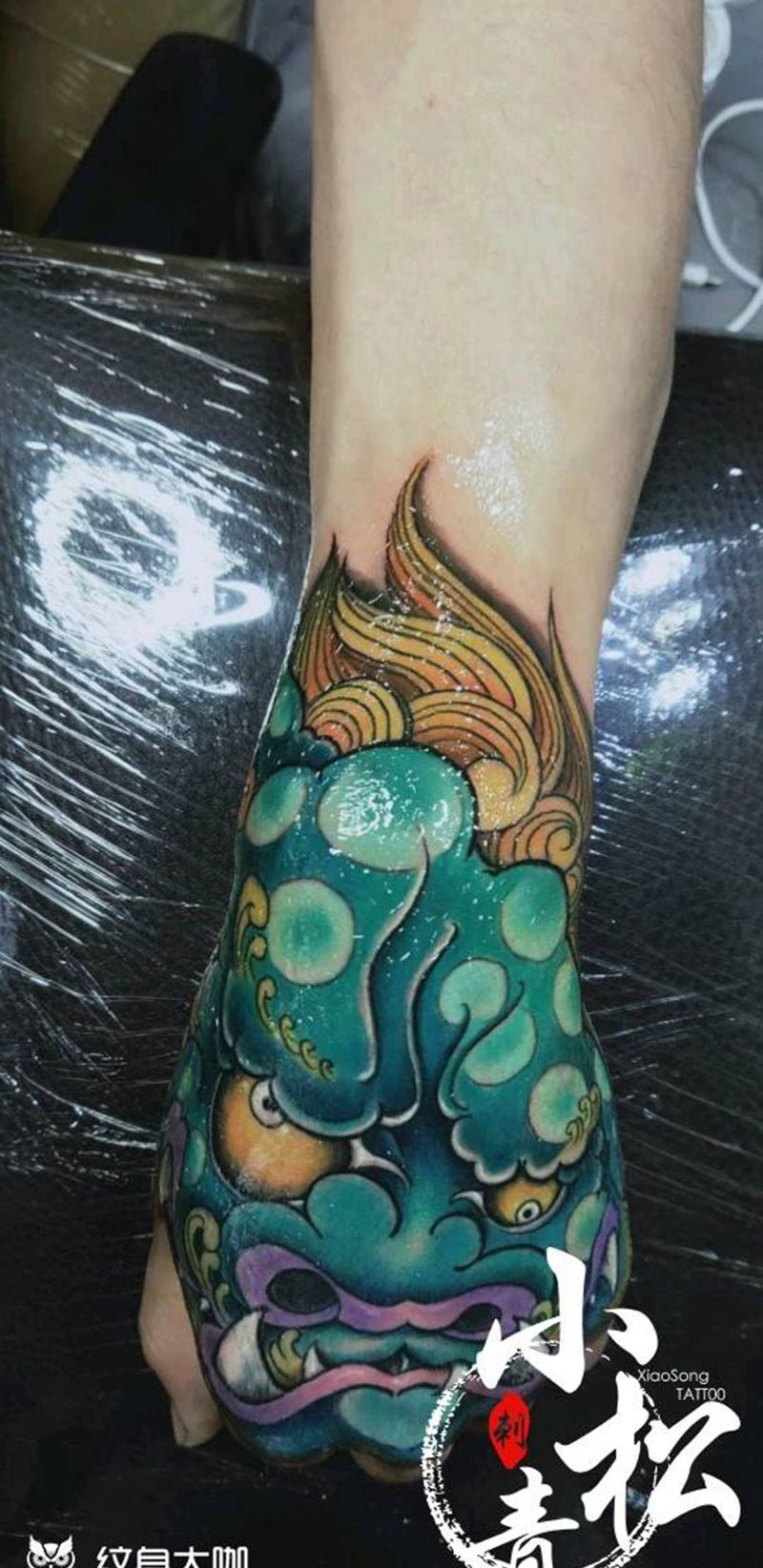 当前位置: 首页 >北京市纹身店-小松刺青工作室纹身图案>彩色手背唐狮纹身图片_手部新传统纹身图案
