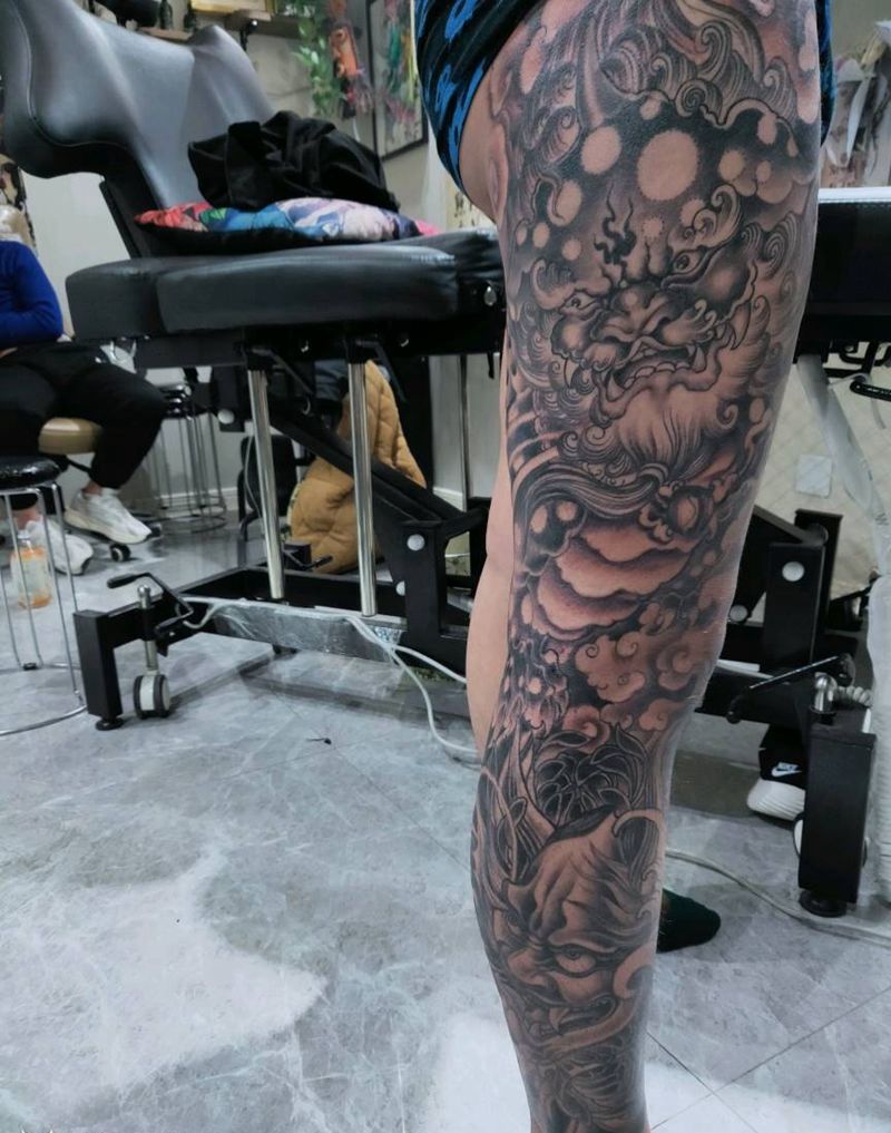 当前位置: 首页 >北京市纹身店-小松刺青工作室纹身图案>传统唐狮花腿纹身图片_腿部新传统纹身图案
