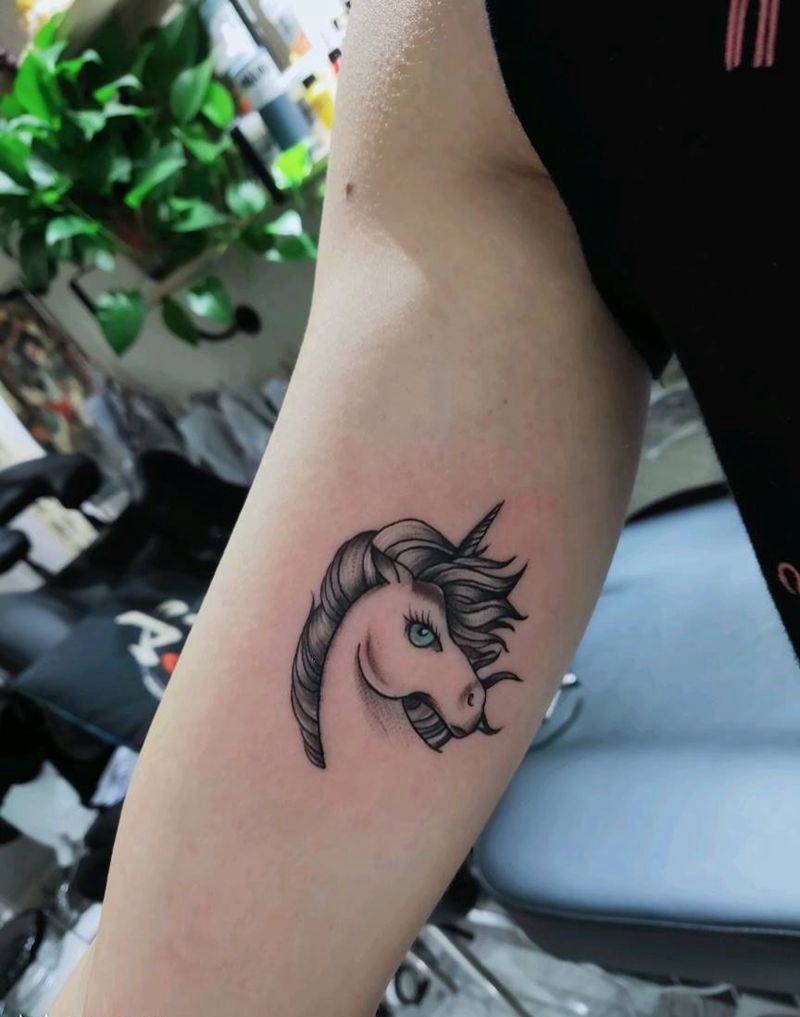当前位置: 首页 >北京市纹身店-小松刺青工作室纹身图案>清新独角兽纹身图片_手臂点刺纹身图案