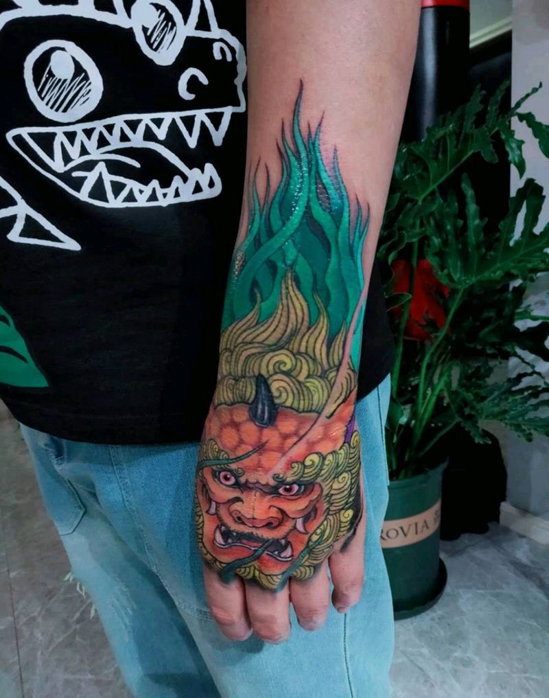 重彩唐狮花手,纹身图片_手部新传统纹身图案