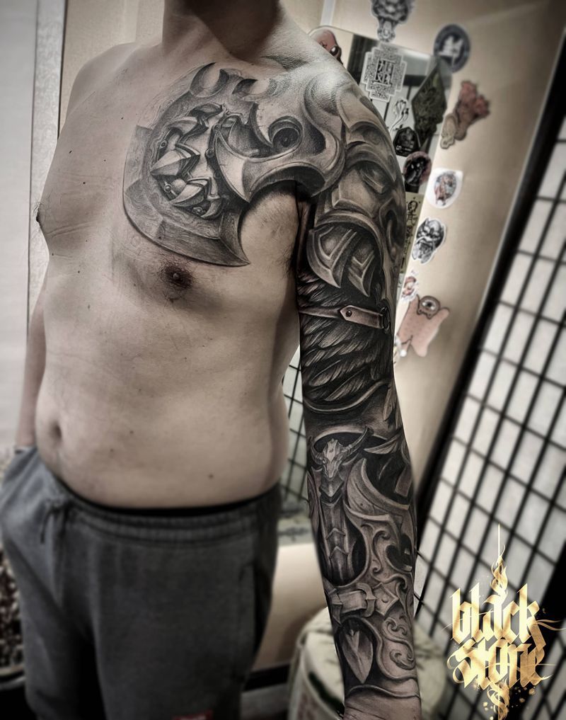 当前位置: 首页 >天津市纹身店-黑石刺青(天津店)纹身图案>牛头甲纹身图片_手臂胸部欧美写实盔甲纹身图案