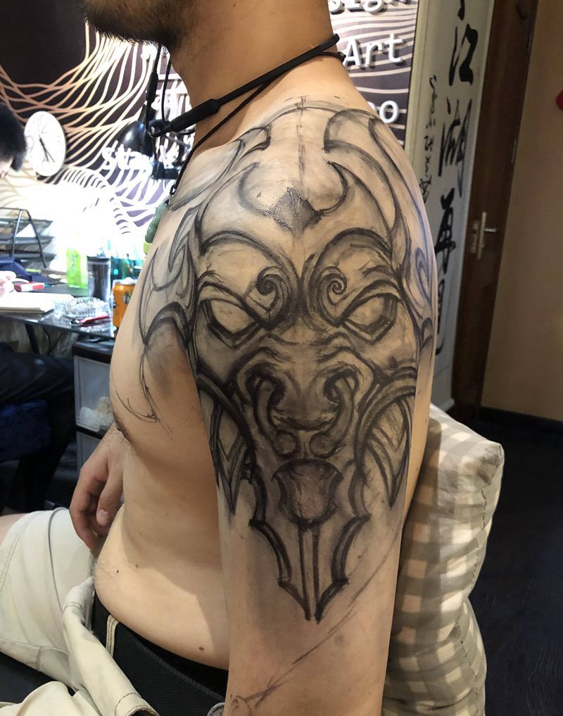 当前位置: 首页 >天津市纹身店-黑石刺青(天津店)纹身图案>牛头甲纹身图片_手臂胸部欧美写实盔甲纹身图案