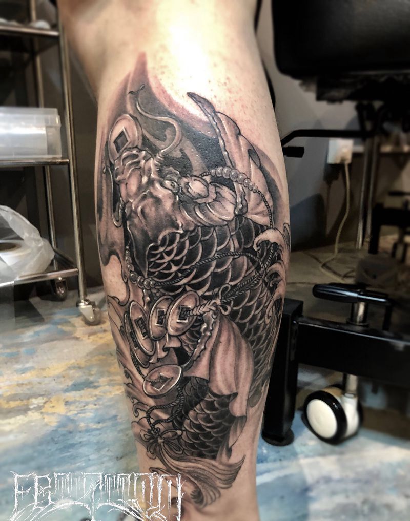 当前位置: 首页 >天津市纹身店-黑石刺青(天津店)纹身图案>旺财纹身图片_腿部新传统鱼铜钱锦鲤纹身图案