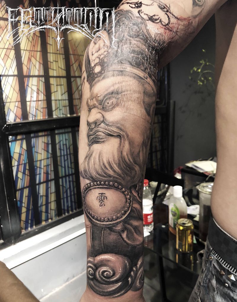当前位置: 首页 >天津市纹身店-黑石刺青(天津店)纹身图案>大梵天纹身图片_手臂新传统欧美写实天王雕像花臂纹身图案