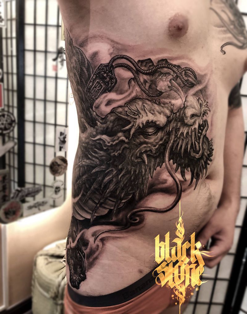当前位置: 首页 >天津市纹身店-黑石刺青(天津店)纹身图案>龙游纹身图片_腰部腹部新传统欧美写实龙纹身图案