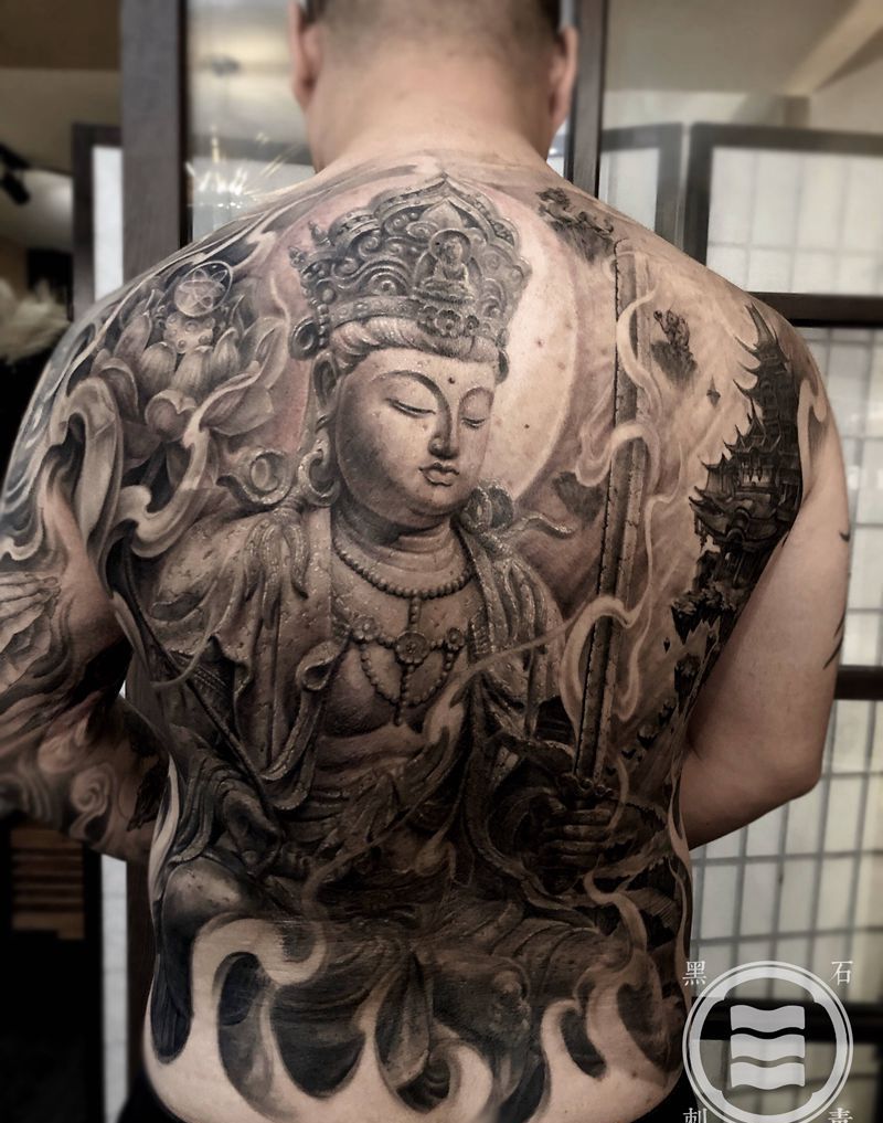 虚空藏菩萨纹身图片_背部新传统欧美写实虚空藏菩萨石雕纹身图案